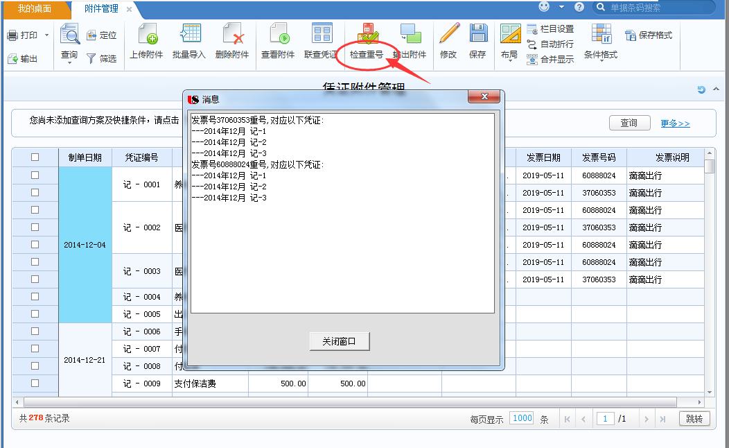 附件上传、删除、查看附件,批量上传、检查重号、输出附件、联查凭证 |